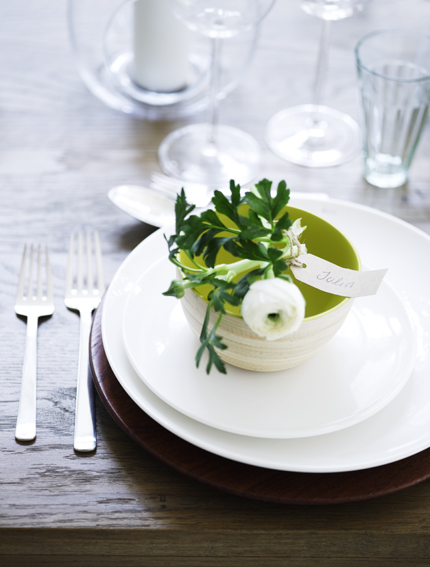 Den tidligere køkkenchef på den japanske restaurant Ebisu, Benjamin Hughes, tilberedte en smuk forårsfrokost og jeg dækkede et rustikt træbord med snehvidt porcelæn, sølvbestik og bambusskåle i limefarver. Gæsterne blev budt velkommen med en afklippet julerose, hvorom jeg bandt et stykke sejlgarn og et navneskilt. Midt på bordet – en stor glasvase med høje næsten udsprungne syrengrene og rundt omkring spisebordet et hav af løgplanter i farvede bambusskåle. Byd foråret velkomment på japansk.